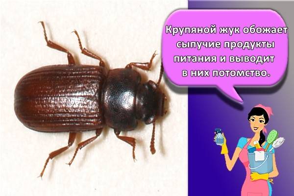 Крупяной жук обожает сыпучие продукты питания и выводит в них потомство. Насекомое сложно обнаружить, поскольку длина тела у него всего 3,5 или 4 мм. Мукоед Суринамский выделяет в крупу экскременты, и продукт начинает гнить.