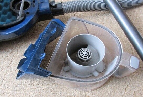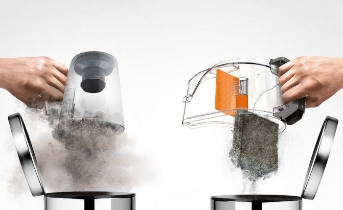 Обычно кроме основного резервуара есть небольшое промежуточное отделение, где остаются крупные частички мусора и волосы. А мелкую пыль генерируемый поток воздуха центробежной силой выталкивает в основную емкость.