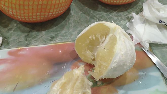 - После этого, части кожуры легко отделяются от внутреннего содержимого. Но здесь нужно быть осторожным, так как белая мякоть содержит некоторую долю растительных эфирных масел и оставляет на руках налет. Можно оставить на одежде жирный следы.