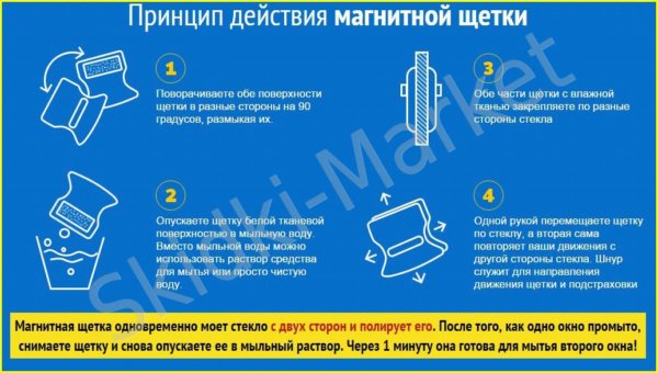 Магнитная щетка для мытья работает одновременно с обоих сторон: движение одной части вызывает перемещение второй составной части этого механизма. Губки, которыми оснащаются эти механизмы, могут быть сделанными из разных материалов, они отличаются у разных производителей. Возле губчатой поверхности находится скребок из резины, что удаляет излишки влаги и подсохшие загрязнения.