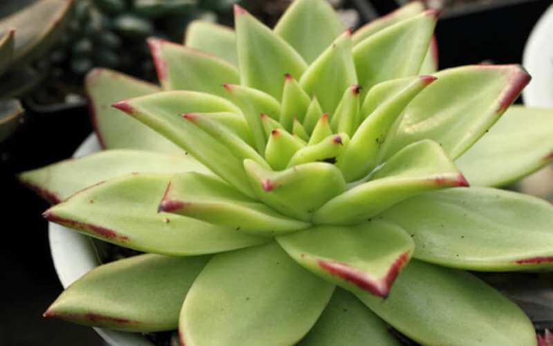 Один из самых многочисленных видов семейства суккулентов. Листья вытянутые, узкие, с заостренными, окрашенными в алый цвет, кончиками. Розетка имеет форму звезды, диаметр её – 15 см. Цветет летом ярко-желтыми цветами колокольчатой формы. На представленном ниже фото сорт Эхеверия Пулидонис: