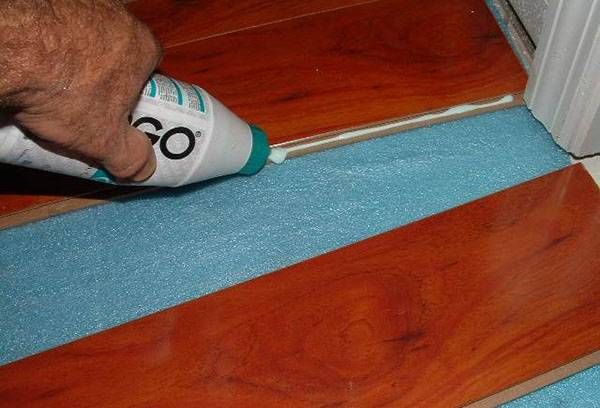 - Если ламинат укладывается на пол, имеющий частый и прямой контакт с водой, то клей нужно использовать такой, который мог бы защитить стыки от влаги, полностью герметизируя шов. Если щелей в ламинате не будет благодаря качественному клею, то и срок службы покрытия увеличится.
