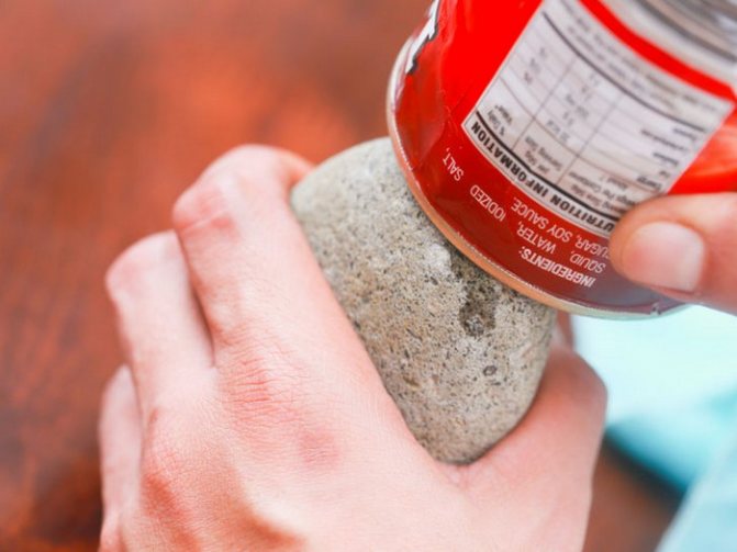 Трите до тех пор, пока не увидите на камне небольшое количество жидкости. Это будет сигналом, что ваши старания увенчались дыркой в жести. Главное, вовремя перевернуть банку обратно, пока весь ваш ужин не оказался на орудии труда.
