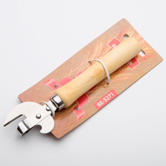 Обычная консервная открывалка представляет из себя нехитрое изобретение, состоящее из деревянной или пластмассовой рукоятки, на конце которой закреплен заточенный с одной стороны металлический нож и металлическая петелька.