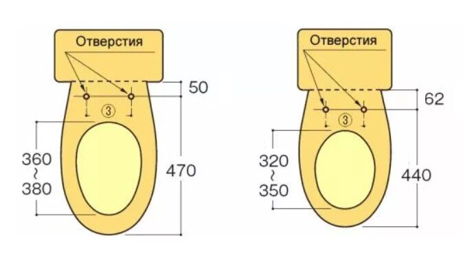 Необходимо замерять ширину модели унитаза. За крайние точки берутся места с наибольшим расстоянием. Длина измеряется от точки осевой линии до края фронтального места бордюра. Важно знать расстояние между отверстиями для крепления крышки.