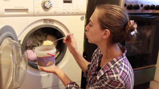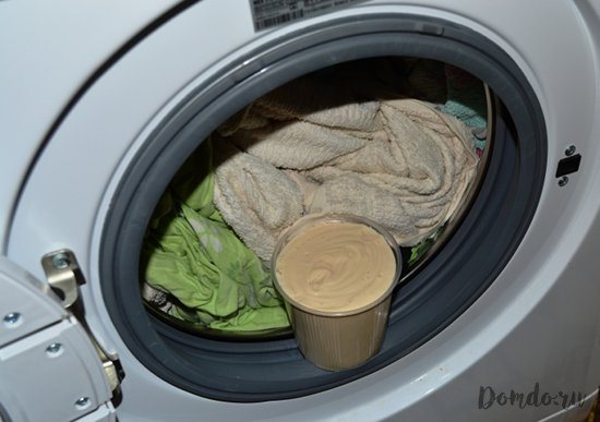 Приготовленную пасту засыпают непосредственно в барабан стиральной машины, но нужно обязательно использовать специальный контейнер.