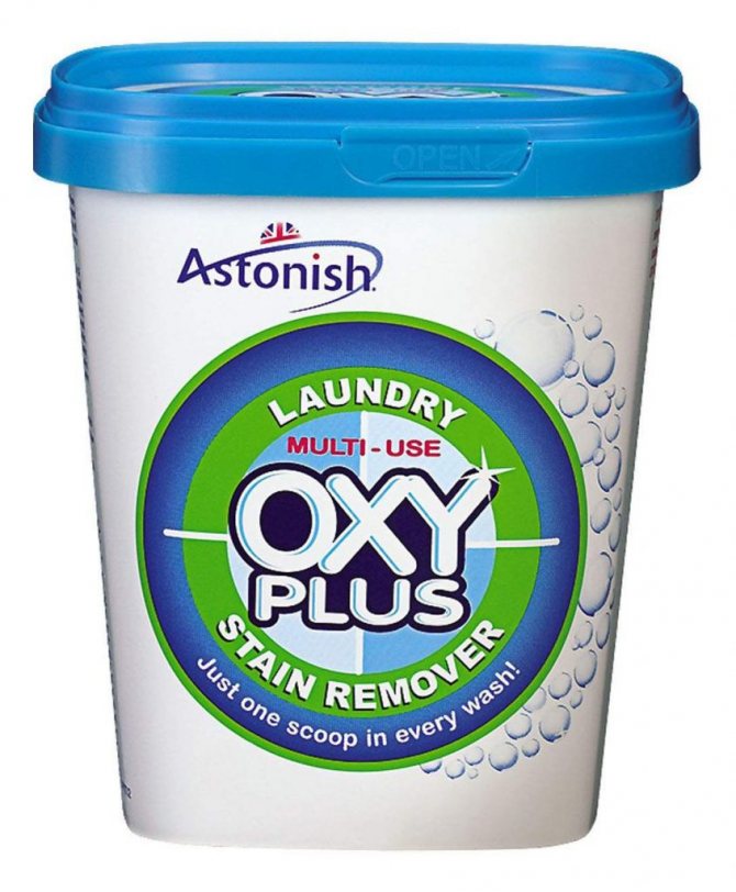 Среди продукции более дорого класса стоит выделить Astonish OXY PLUS. Это средство британского производства обладает одним из самых сильнодействующих составов. Он содержит такие компоненты, как пероксигидрат карбоната натрия и соду, которые позволяют удалять пятна даже от плесени, крови, масел, жира. Средство может использоваться для чистки одежды, брезента, мебели, плитки и прочего.