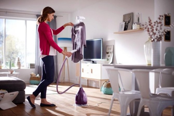 Особенно удобен прибор для штор, широкие полотна которых желательно гладить вертикально. Утомительная глажка множества метров ткани становится упрощённым занятием. Постиранная материя любой плотности и качества легко поддаётся обработке паром. При этом можно не бояться припалить её, как это порой случается при традиционной глажке утюгом.