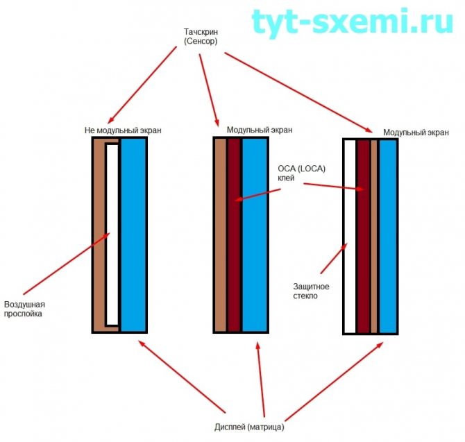 - Модульная сборка. И сенсор, и дисплей — это единое целое. Между ними нет воздушной прослойки, вместо нее есть клей, который покрывает всю площадь. К такому бутерброду сверху добавляется стекло, которое выполняет защитную функцию. Или например, может быть только дисплей и сенсор, а защитного стекла нет (не путать с защитной пленкой).