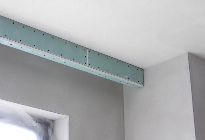 Готовый короб шпаклюют, при необходимости на местах стыков приклеивают армирующую ленту. Всю конструкцию красят и украшают потолочным плинтусом.