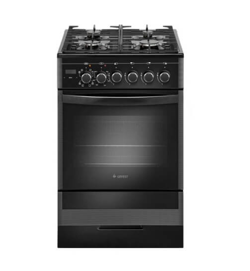 Бюджетная и малогабаритная модель, произведенная в России. Есть режим гриль мощностью 1,5 кВт. Простое управление, отличное освещение духовки, автоподжиг конфорок и газ-контроль — все эти функции делают плиту отличной покупкой для пожилых людей, которым необходима простая и понятная техника.